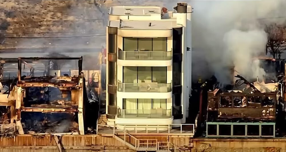 A foto abaixo viralizou na Internet. Ela mostra uma das raras casas construidas de concreto, que sobreviveu aos incêndios florestais catastróficos que, em janeio passado, fizeram arder a área metropolitana de Los Angeles.