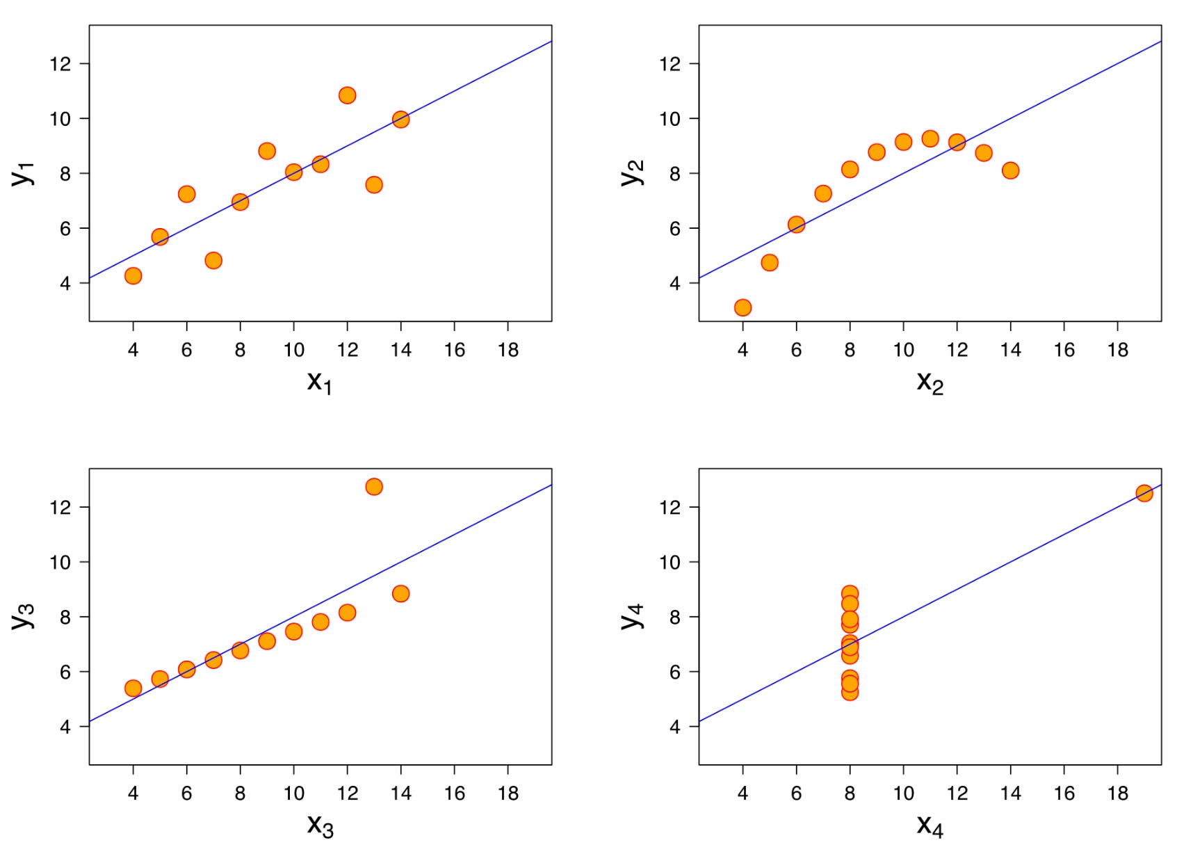 Em 1973 o estatístico britânico Francis John Anscombe (1918-2001) criou quatro conjuntos de números que tinham a mesma média, mesma variância, mesma correlação e mesma regressão linear.